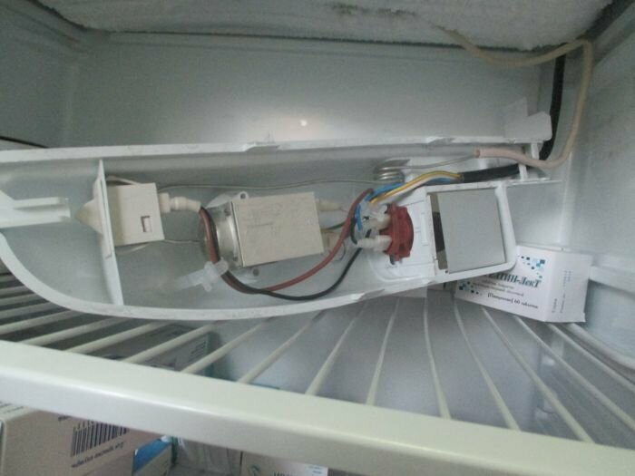 - Когда лампочка горит, то, наверное, вышел из строя терморегулятор. Находим 2 провода, идущие к терморегулятору, и замыкаем их. Если холодильник заработал, то производим замену терморегулятора.