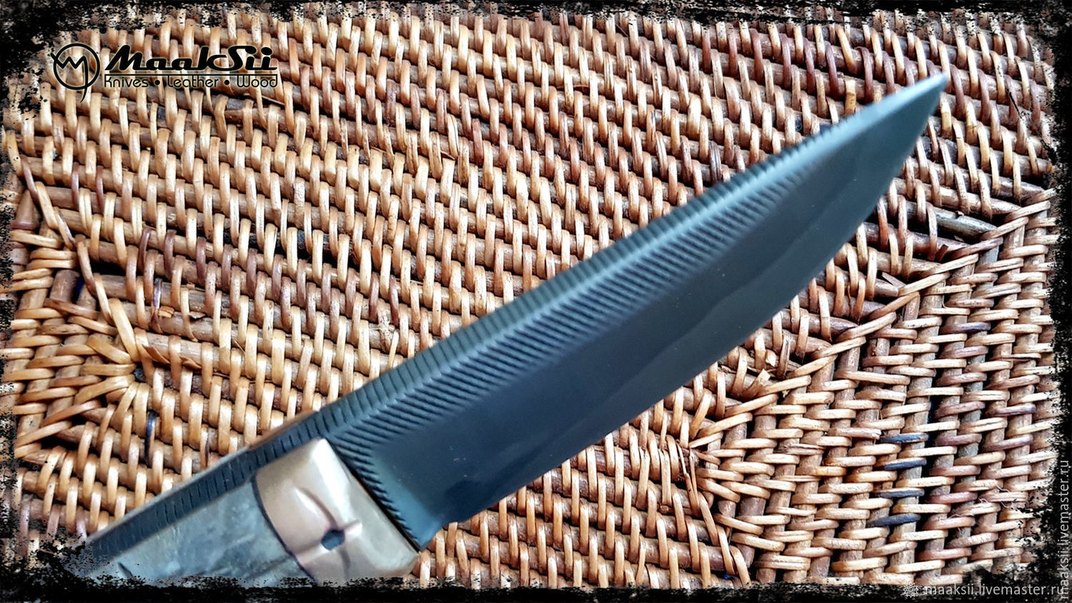Традиционно для нее использовали различные виды древесины или бересту. Считается, что рукоятка не только должна удобно лежать в руке, но и не холодить ее, не травмировать, а также иметь водоотталкивающие свойства. Ее насаживают на хвостовик или крепят к нему с помощью заклепок. Сегодня в производстве — не только дерево, но и современный прочный и красивый пластик, композиционные материалы. Если производится изготовление ножей на заказ, клиент может выбрать понравившийся, в том числе – различные сплавы.