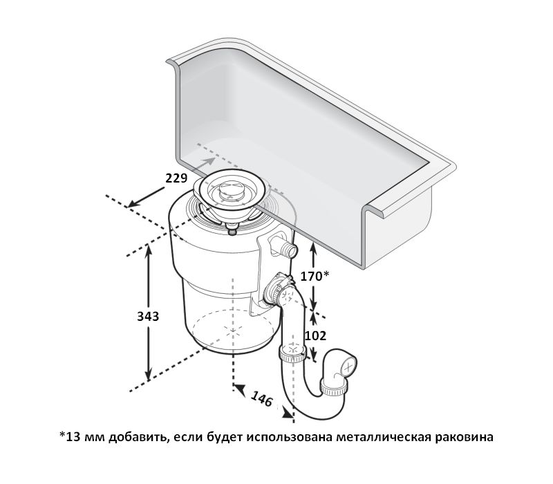 Кухонный измельчитель монтируется непосредственно под мойку, заменяя собой сливной сифон. Его габариты приблизительно соответствуют размерам пятилитровой бутыли, поэтому громоздкие предметы под одинарной раковиной не поместятся.