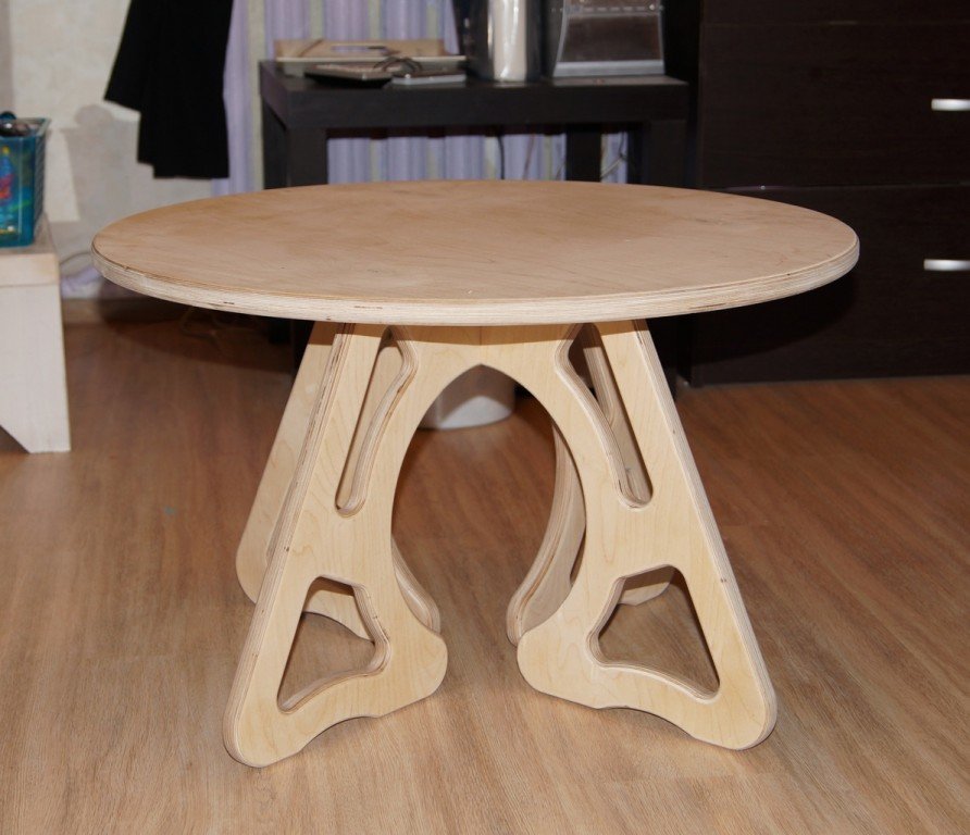 Стол из фанеры может быть самой причудливой формы. Вот таким, например, как на этой фотографии.