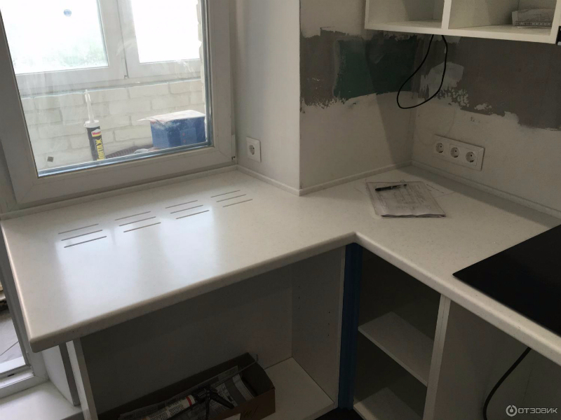 Устанавливается подоконник столешница на кухне после того, как старая панель будет демонтирована.