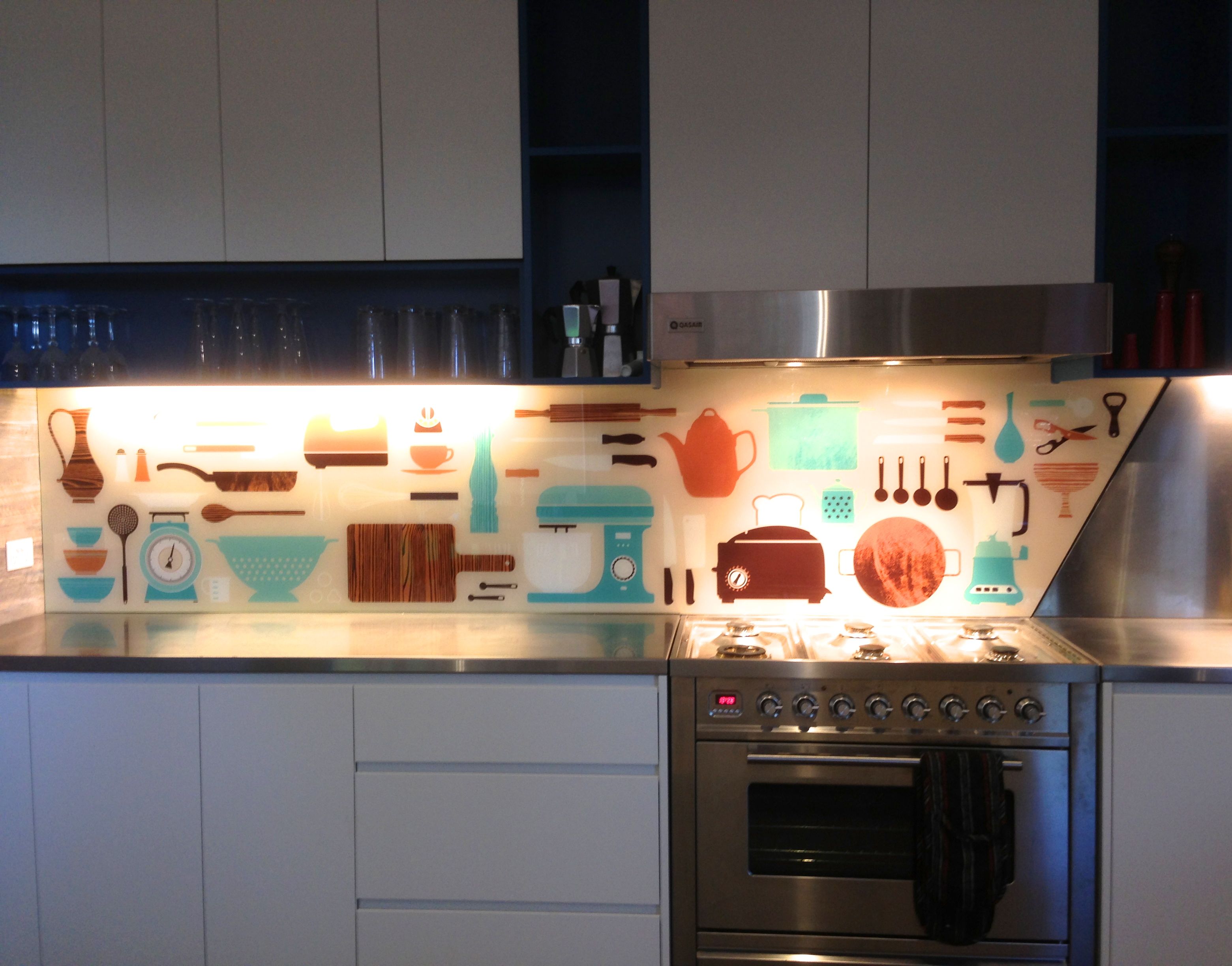 При желании под стекло можно разместить любые инсталляции, способные оживить интерьер вашей кухни или с помощью пескоструя нанести надписи, украшающие кафе и рестораны. По желанию панель можно просто сделать матовой.
