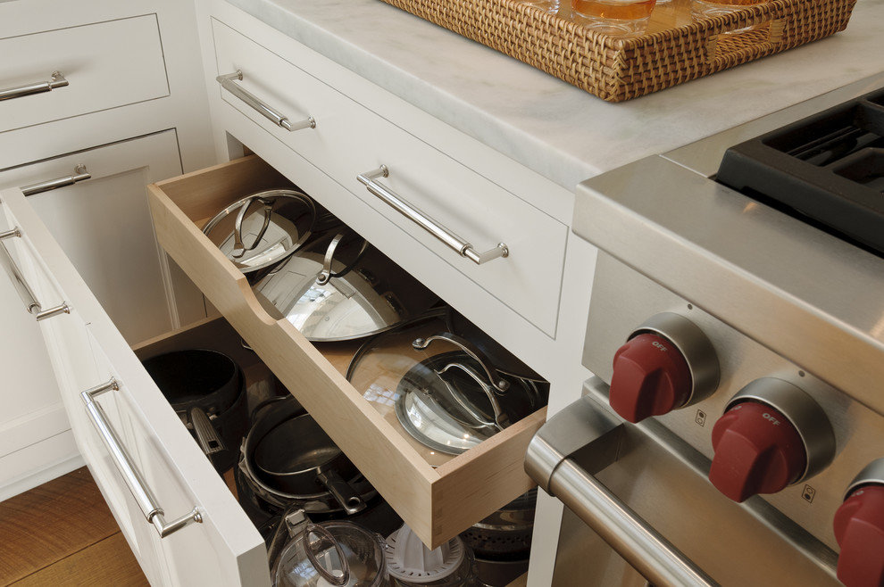 Один из секретов удобной кухни — продуманная система хранения столовых приборов, посуды, бытовой техники и прочих предметов. Функциональные ящики облегчают жизнь хозяйки, а неорганизованное рабочее место превращает пребывание на кухне в кошмар.