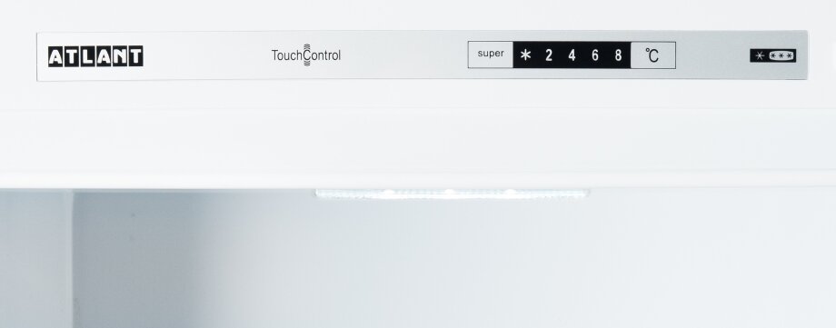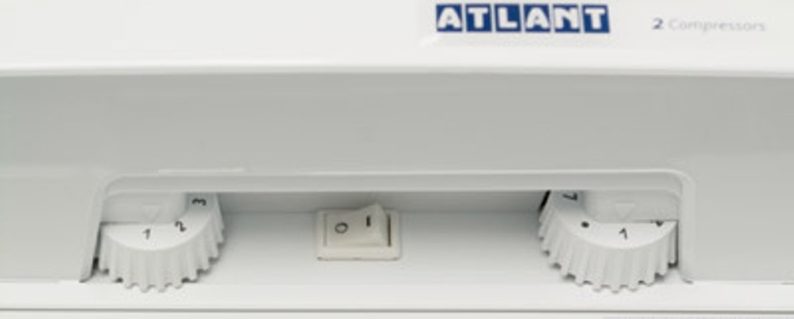 В верхней части холодильника расположены ролики для регулировки температуры камер. Например, у холодильников Атлант с двумя компрессорами есть возможность задавать температурный режим отдельно для холодильной и морозильной камеры. Следить за работой отделений холодильника, температурой и степенью заморозки можно с помощью световых индикаторов: зеленый – нормальное состояние, красный – недостаточный температурный режим (например, при первом включении или после мытья одного из отделений).Режим «Заморозка» обозначен желтым цветом.