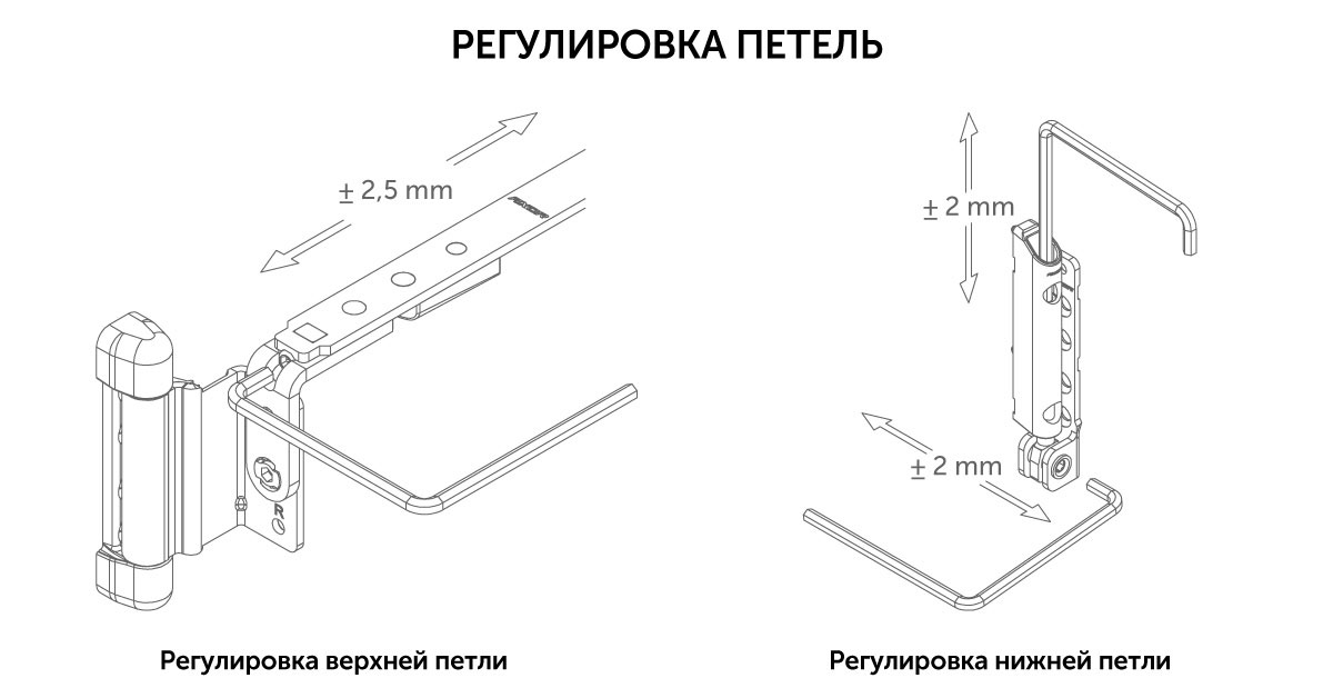 - Регулировка прижима двери осуществляется в горизонтальном положении во время поворотов то в одну сторону, то в другую вокруг верхней петли.