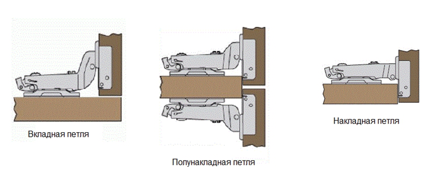 Подобный тип петель целесообразно использовать для мебели, в которой дверца закрывает боковые части ниши, куда она установлена.