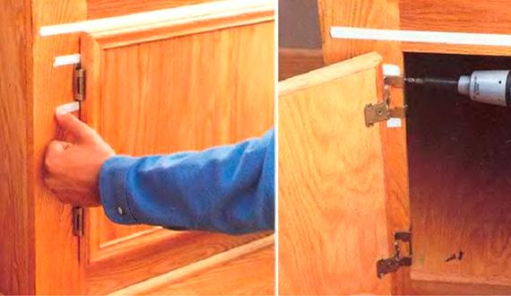 Фото 5. Установите чашки петель. Используйте доску для обрезков с прямым краем, чтобы выровнять их параллельно краю двери.