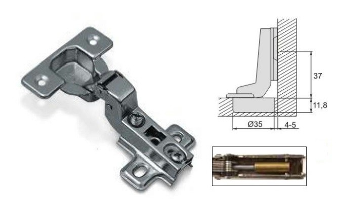 Наиболее распространена четырехшарнирная накладная петля, размер ее бывает различным, но обычно для мебели используют фурнитуру с диаметром чашки, равным 35 мм.