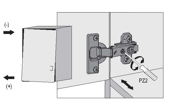 С ее помощью можно перемещать дверку относительно каркаса шкафа вверх или вниз, выравнивая их положение относительно друг друга. - Коррекция петель в горизонтальном положении. С помощью такой регулировки обеспечивается свободное движение дверцы при открытии или закрытии. Главная цель корректировки состоит в том, чтобы устранить зазоры между дверцей и шкафом, если мебель установлена на неровном полу.