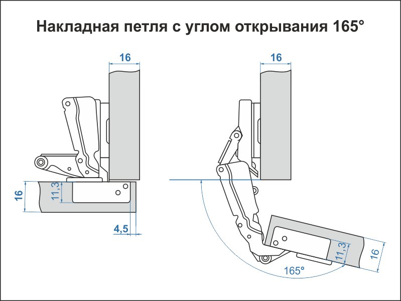 Угол петли в закрытом состоянии – 90 градусов, в открытом – 110 градусов. Используются в том случае, если есть необходимость установки петель на одну перегородку, чтобы открывать дверки в разные стороны (при установке накладных петель двери не смогут открываться).