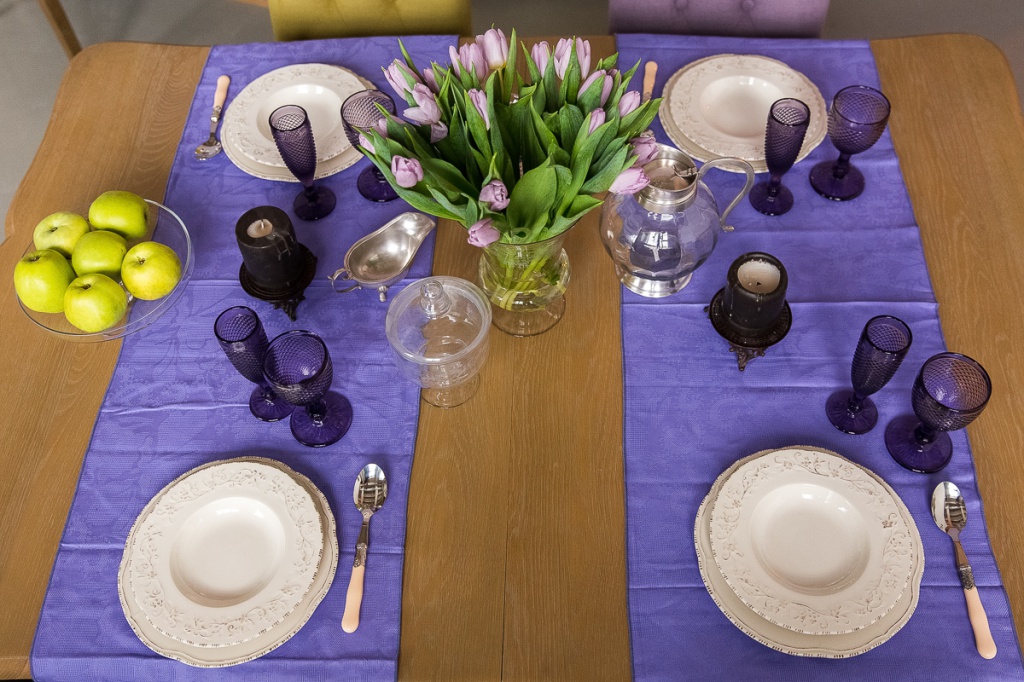 Декор стола лучше всего визуально объединяется с помощью раннера (узкая полоса ткани вдоль стола, вместо традиционной скатерти)