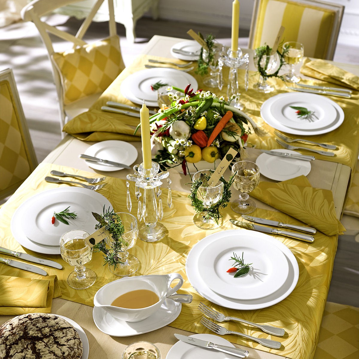 Скатерть надо заменить с разноцветной на однотонную. В идеале – белоснежное крахмальное полотно. Скатерть для ужина можно украсить орнаментом в виде широкой полосы по краю.