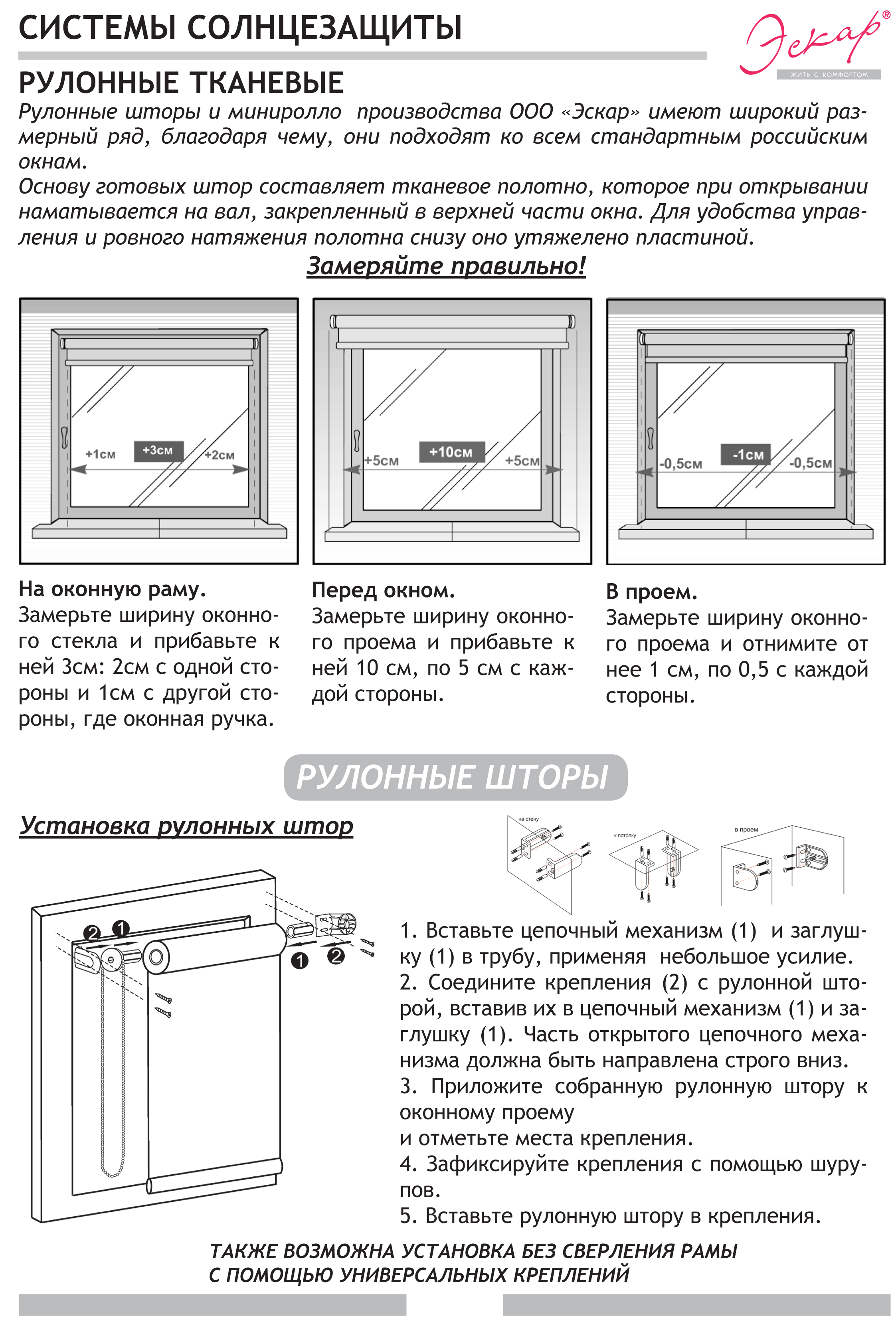 Данная инструкция предназначена для тех, кто планирует крепить тканевые роллеты на стену. Их можно установить над оконным проемом или внутри него. Перед проведением работ необходимо проверить, смогут ли полотна свободно двигаться.