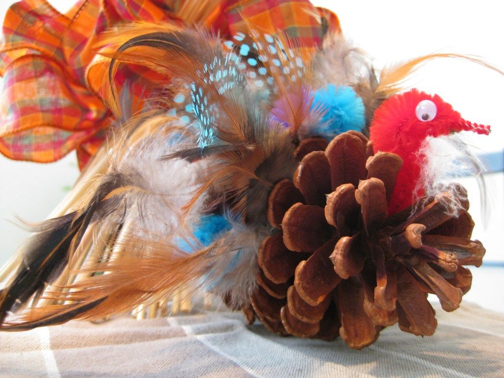 Сразу присоединим хвост к верхушке сосновой шишки – туловищу поделки.