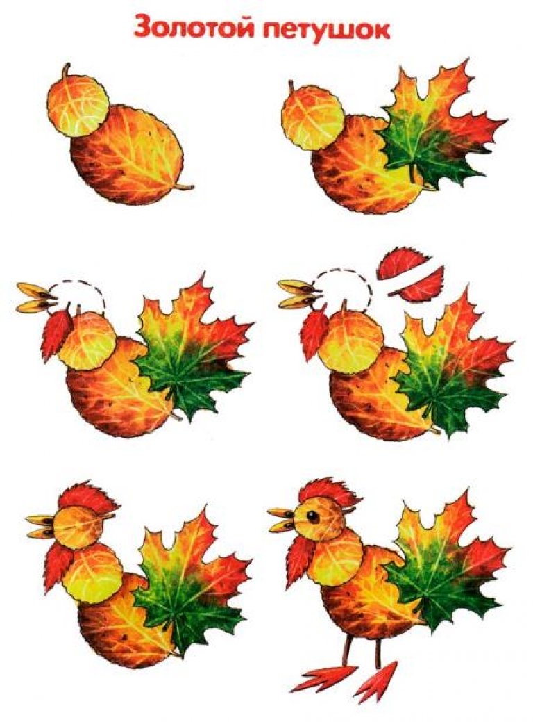 Теперь можно доставать из гербария осенние засушенные листья и выбирать подходящие образцы для оформления крыльев поделки петуха. Нам понравился такой вариант. По одному листу рябины и дикого винограда мы соединили в крыло, склеив детали кусочком оранжевого пластилина.
