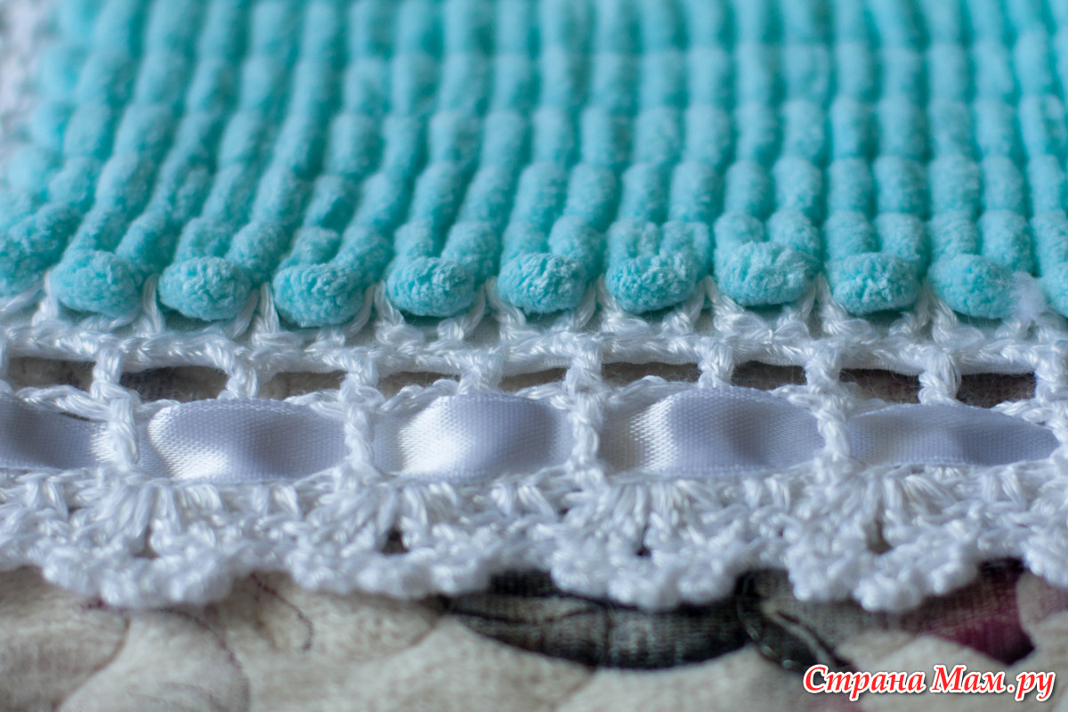 Во втором случае готовый плед удобнее обвязать по периметру крючком столбиками без накида: два – три ряда.