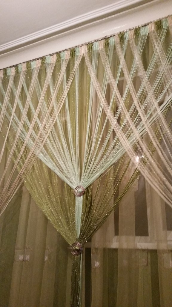 Нитяные шторы или кисея представляют собой ряд из слоя нитей, ниспадающих к полу. Цветовые решения и дизайн позволяют подобрать оформление окна или дверного проема для любого стиля интерьера. В качестве отделки применяется вышивка, стеклярус, бусины, камни, стразы и люрексовые нити.