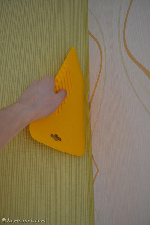 - После того как обои состыковали, их надо тщательно пройти шпателем.