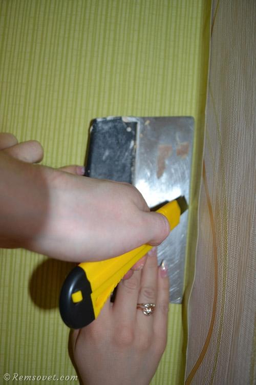 - ровный край необходимо клеить по отвесу, лишнюю часть обрезать с помощью канцелярского ножа.