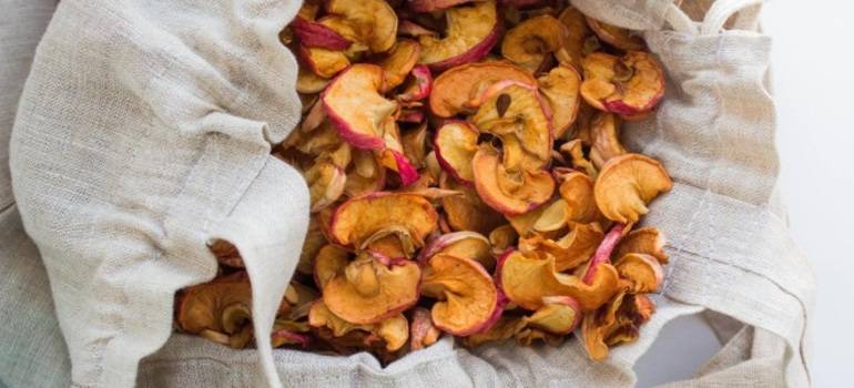 Такие виды сухофруктов, как сушеные бананы, киви, яблочные чипсы, ананасовые цукаты, отлично хранятся в тканевых или холщевых мешочках. Чтобы продукт не отсыревал в помещении, разместите рядом с ним емкость с солью или рисом, которые будут впитывать лишнюю влагу.