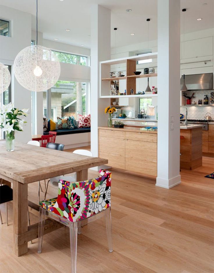 Последний и не менее популярный способ для зонирования пространства может стать приобщение обеденного стола. Если вы часто приглашаете к себе гостей или попросту любите проводить время за обеденным столом, то такой вариант может стать вашей палочкой-выручалочкой. Для тех, кого часто посещают друзья или родственники подойдет вариант с длинным столом, который визуально разделит пространства. Для тех, кто не так часто принимает гостей у себя дома подойдет обычный стол трансформер.