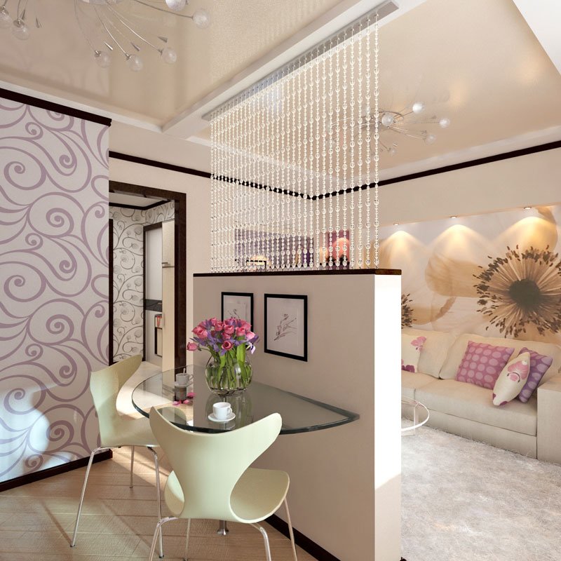 Доступным способом разделением пространства является освещение. Совершенно точно, свет должен быть распространен по всем зонам. Отдельное освещение в кухне, и такое же в гостиной. Прекрасно будет выглядеть разделение пространства с помощью светодиодных лампочек и светильников.
