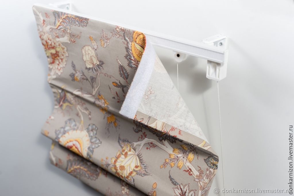 Кольца крепятся к внутренней части полотна, на одинаковом расстоянии в местах предполагаемых складок. Фиксация колечек производится на текстильную липучку, жесткая часть которой крепится к бруску и играет роль карниза, а мягкая – к верхнему изнаночному краю полотна. Три крепежных ушка крепятся с изнаночной стороны полотна напротив рядов колец, а четвертое – в месте вывода шнуров.