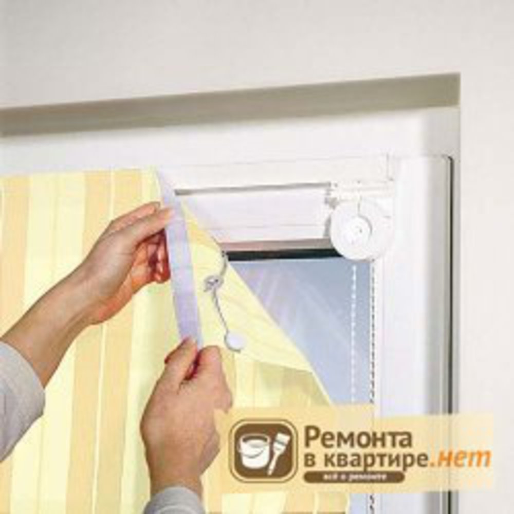Протестируйте открывание и закрывание и убедитесь, что складки ложатся ровно и равномерно. - Если вы решили крепить штору на створку окна или раму, то возьмите текстильную «липучку» нужно длины и прикрепите ее к выбранной плоскости. Это можно сделать с помощью скотча. Иногда рекомендуют использовать мебельный степплер, но это и некрасиво, и неудобно. Лучше воспользоваться саморезами самого маленького диаметра и с их помощью зафиксировать липкую ленту на окне. После этого приложите липучку шторы к укрепленной на окне ленте. Прижмите покрепче. Затем проведите испытания шторы – как она закрывается и открывается, насколько ровно ложиться и послушно движется.