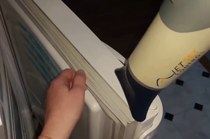 - Плоская отвертка вставляется в щель между уплотнителем и дверцей, отверткой надрывается монтажная пена, которой закрепляется материал.