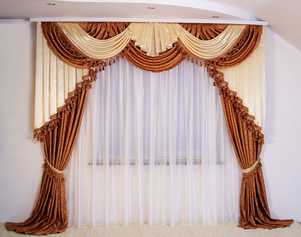 Они располагаются от горизонтальной поверхности на расстоянии 1 сантиметр. Такая строгость классики была актуальной всегда. Она отличается особой привлекательностью. Высоту помещения такое решение визуально увеличивает, но при изготовлении занавесок может создавать дополнительные сложности.