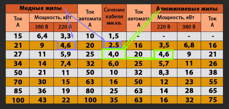 | Максимально потребляемый ток | Сечение проводов питающего кабеля (медь), в мм | Сечение проводов питающего кабеля (алюминий), в мм |