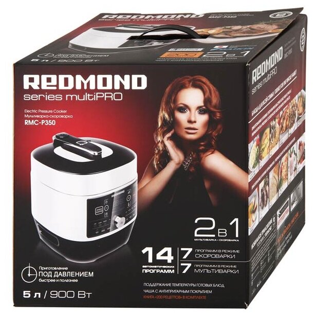 Еще рассматривм мультиварку-скороварку из популярных у нас марок — Redmond RMC-P350. Данная модель оснащена отдельными автопрограммами для мультиварки и скороварки — по 7 на каждую. В режиме скороварки возможна регулировка давления пара в диапазоне от 30 до 70 КПа, что влияет на скорость приготовления пищи. Также присутствует режим «Мастер шеф», при помощи которого вы легко скорректируете параметры температуры и времени приготовления, а также уже привычные «Таймер отсрочки» и «Автоподогрев».