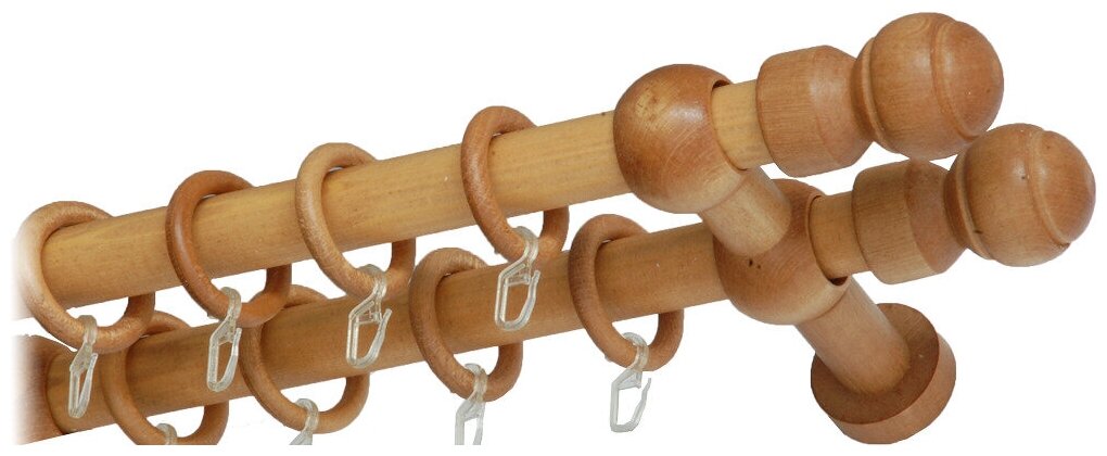 Классический двухрядный карниз настенного крепления. Штанга и фурнитура выполнены из дерева, второй ряд — металлическая направляющая. Благодаря традиционной форме наконечников, карниз гармонично впишется в интерьер, при этом полностью выполняя свою основную функцию — служить основанием для декоративного оформления окна.
