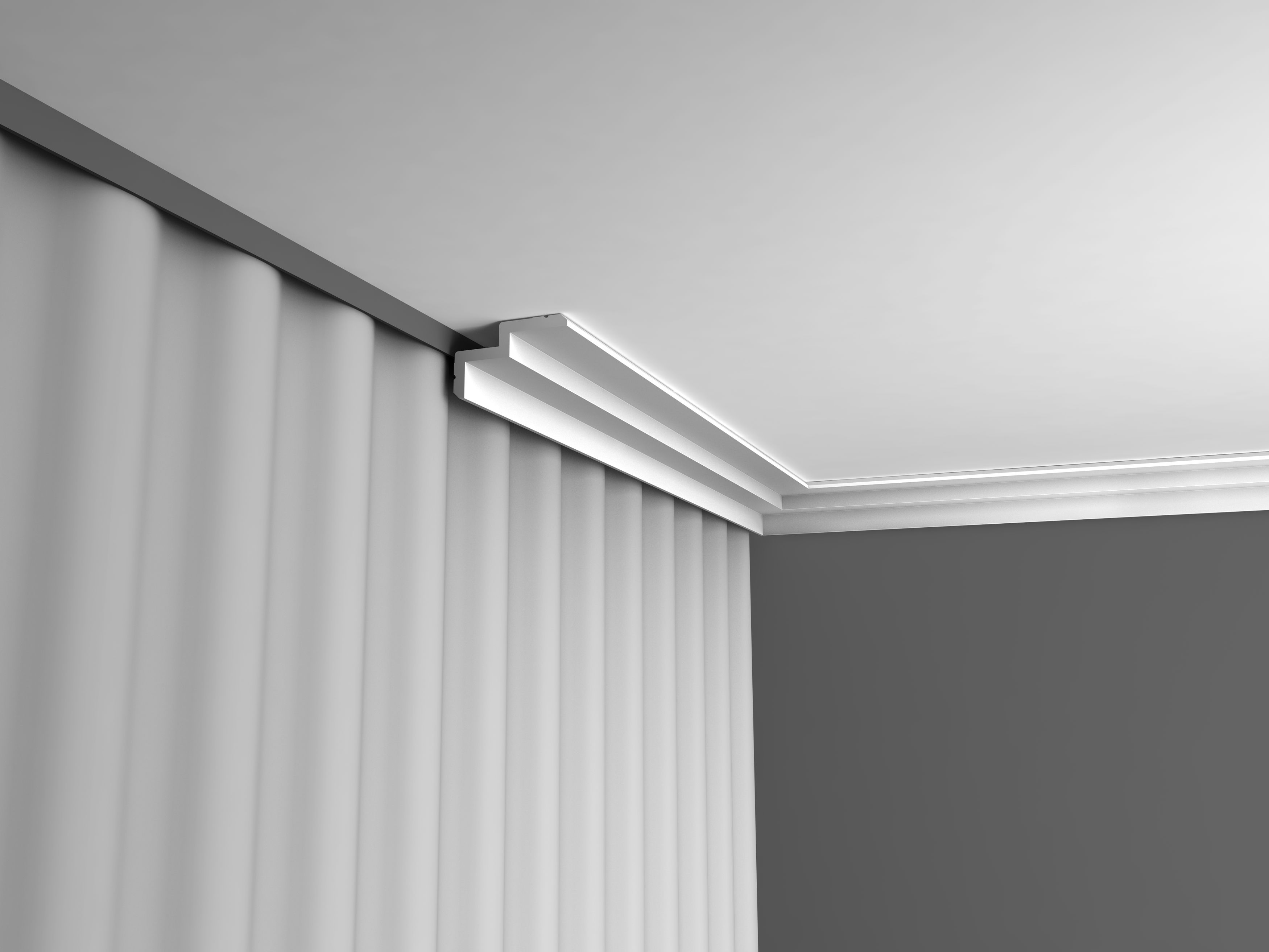 - Карнизы прикручиваются к стене саморезами. Если изделие расположить вплотную к потолку, то его будет совершенно незаметно со стороны, что оно крепится не к потолку, а к стене.