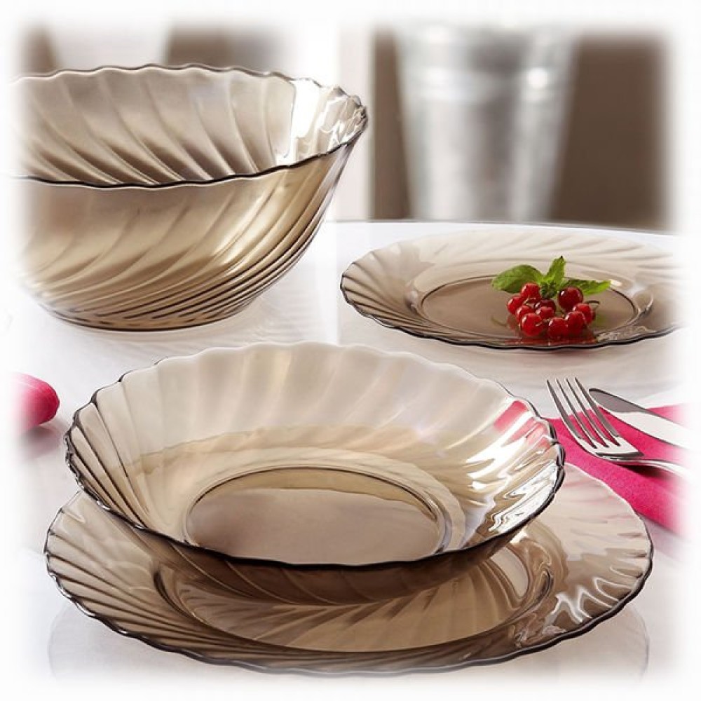 Среди них можно снова упомянуть Luminarc, а также «СВ Гласс Индастри», Pasabahce. В продаже можно встретить очень простые сервизы с небольшими предметами, которые имеют рифленые края. Такого плана тарелочки, бокалы и стаканы, супницы и чайники без труда станут украшением для любого застолья – неважно при этом, будут они сделаны из черного или из коричневого стекла.