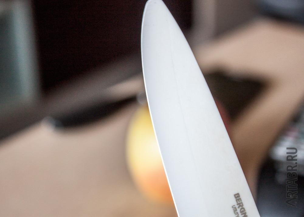Справка. Инструмент из циркониевой керамики в течение 1–2-х лет не требует заточки. Однако постепенно лезвие притупляется, как у остальных ножей.