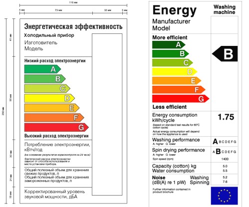 Вся бытовая техника классифицируется на классы эффективности потребления электричества. Каждое обозначение — A, B, C, D, E, F, G, соответствует определенному уровню энергопотребления. Максимальную энергетическую эффективность показывают машинки с маркировкой «А», минимальную — «G». С 1992 года в ЕС унифицировали маркировку — техника, выпускаемая в разных странах, стала маркироваться по одной системе. Единая европейская классификация вскоре была принята по всему миру. Наклейку с соответствующей маркировкой приклеивают прямо на корпус СМА.