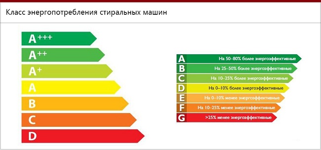 Энергоэффективность стиральных машинок определяется как отношение количества кВт, потребляемых в час, на 1 кг белья. Для СМА с классом А это значение находится в диапазоне от 0,17 до 0,19. В стиралках нового поколения встречаются вариации — А с разным количеством «+». Имея одинаковый расход электричества, они относятся к разным классам.