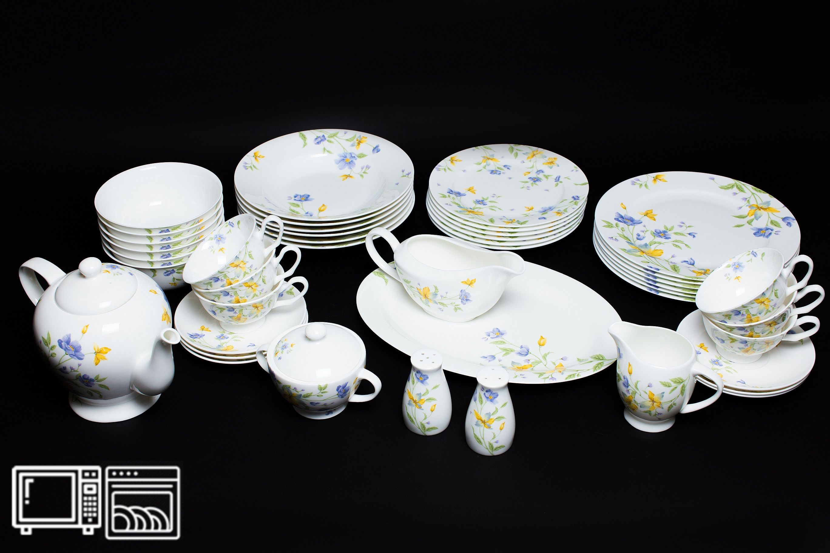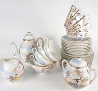 Набор состоит из 41 предмета, включая: 12 чашек, блюдец и тарелок, 2 сервировочные тарелки, 1 миску, сахарницу с крышкой, сливочник и чайник. Ориентировочная дата ок. 1930.