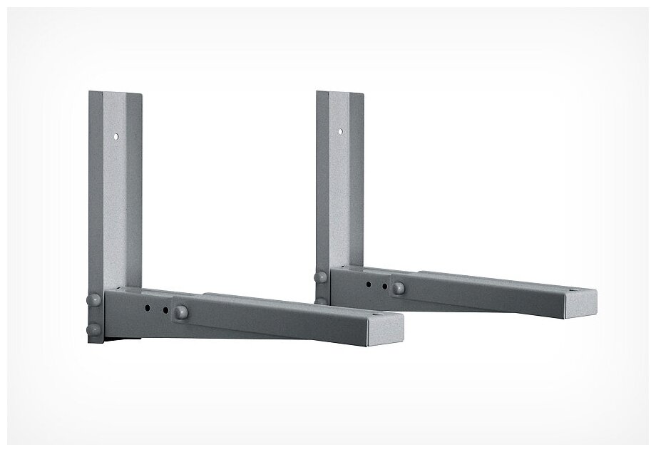 Кронштейн под СВЧ-печку – это два металлических уголка. На одной стороне уголка есть крепления, при помощи которых кронштейн фиксируется к стене. Вторая сторона уголка может иметь фиксированную длину или выдвигается при помощи направляющих.
