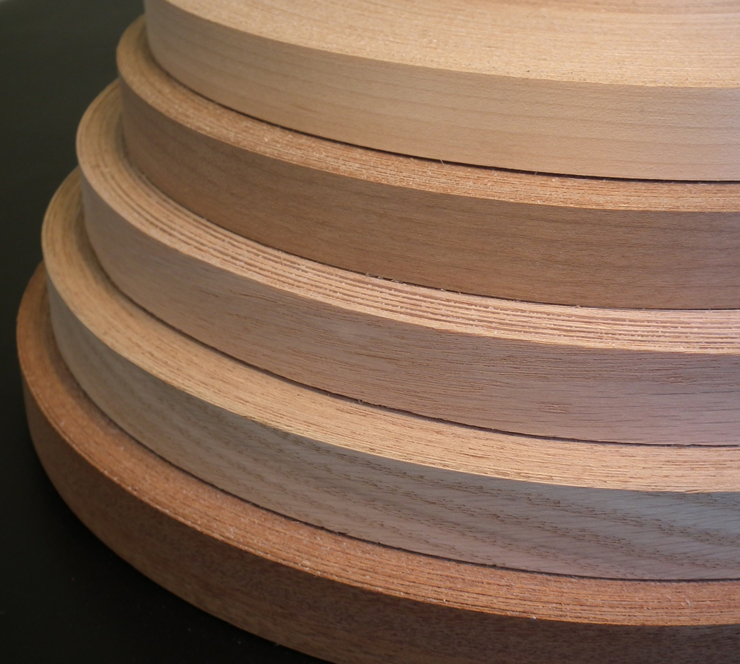 Шпон — тонкий срез древесины, окрашенный и сформованный в виде ленты. Эта мебельная кромка используется на производстве при оклеивании срезов шпонированных изделий. Работа с этим материалом требует определенных навыков, да и материал дорогой.