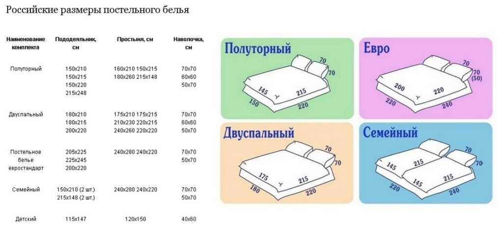 Стандартная размерная сетка тканевых изделий. А теперь пройдемся по каждому составляющему постельного комплекта.