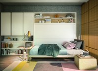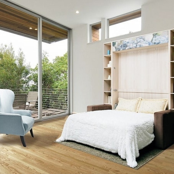Тип откидной кровати бывает вертикальный или горизонтальный. Убранная кровать освобождает место для занятия другими делами.