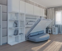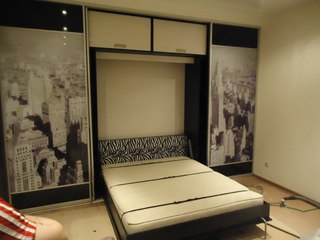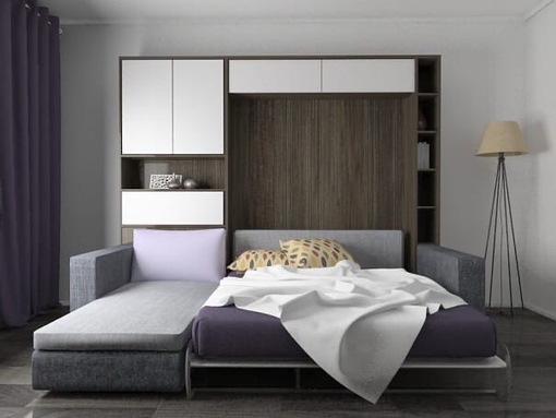 В малогабаритных помещениях часто используют шкаф купе с кроватью на подъемных устройствах. Створки шкафа раздвигаются, кровать опускается, при этом изголовье остается внутри шкафа всего на три десятка сантиметров, что вовсе не мешает. Основным минусом такой конструкции является то, что открытие створки шкафа блокирует соседнюю мебель. Это очень неудобно, поскольку при необходимости что-либо взять с полки, нужно будет снова поднять кровать и закрыть шкаф-купе.