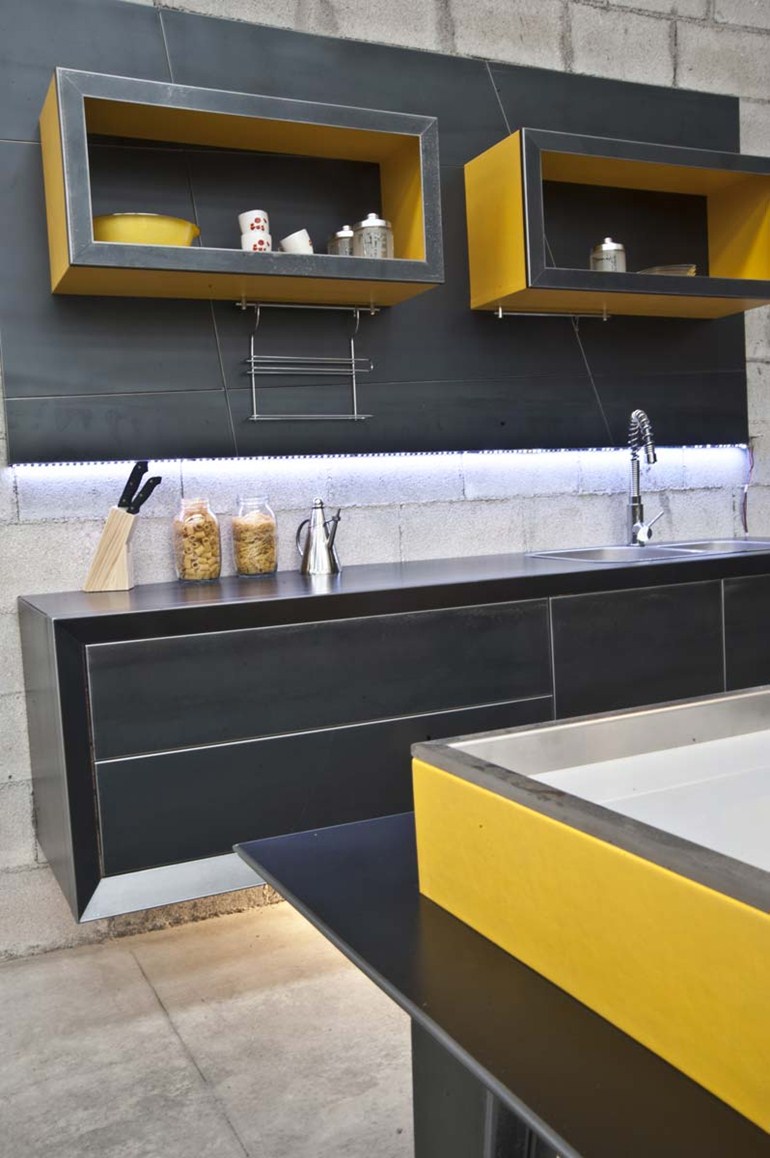 А кухня скрывается за складывающейся панель. Идеальное решения для лофта, где кухня часто совмещается со спальной и гостиной