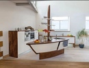 Элегантная индукционная плита установлена по центру столешницы и используется как для готовки, так и в качестве обеденной зоны