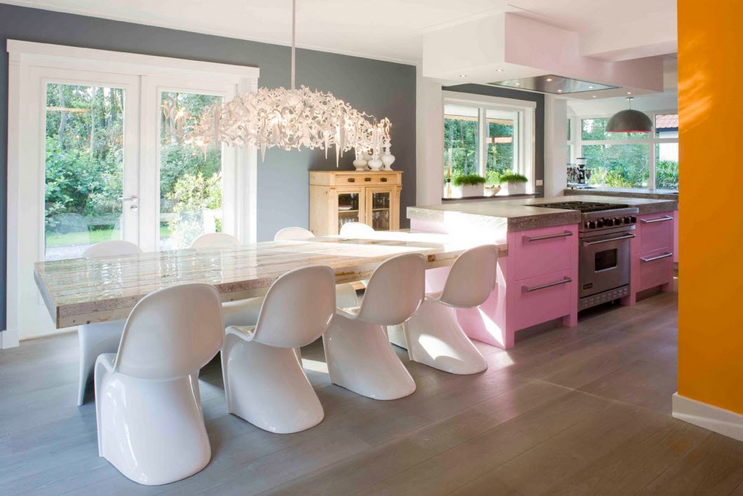 На первый взгляд это пространство может показаться своего рода футуристической сценой закусочной. Тем не менее, это наглядный пример того, как современные кухонные идеи могут сочетать в себе классический и революционный стили дизайна. Яркий белый и фуксия явно доминируют в этом пространстве.Сверхгладкие поверхности переходят от стен к шкафам и к столешницам, а текстура перетекает даже на прозрачные пластиковые столешницы табуретов. Акцент цвета фуксии на вставке обеденного острова добавляет приятный всплеск цвета в области, которая в противном случае могла бы быть размыта. Подвесные светильники из янтаря добавляют третье измерение к двухцветной цветовой схеме, объединяя триаду оттенков, которые можно описать только как поразительные.