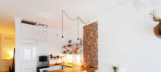 Люстру между кухней и гостиной вешать не рекомендуется, лучше сделать отдельное освещение фонарей для каждой зоны