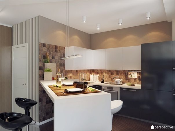 В этом случае одна из частей кухни отводится под место для готовки, а другая – под территорию для обеда.
