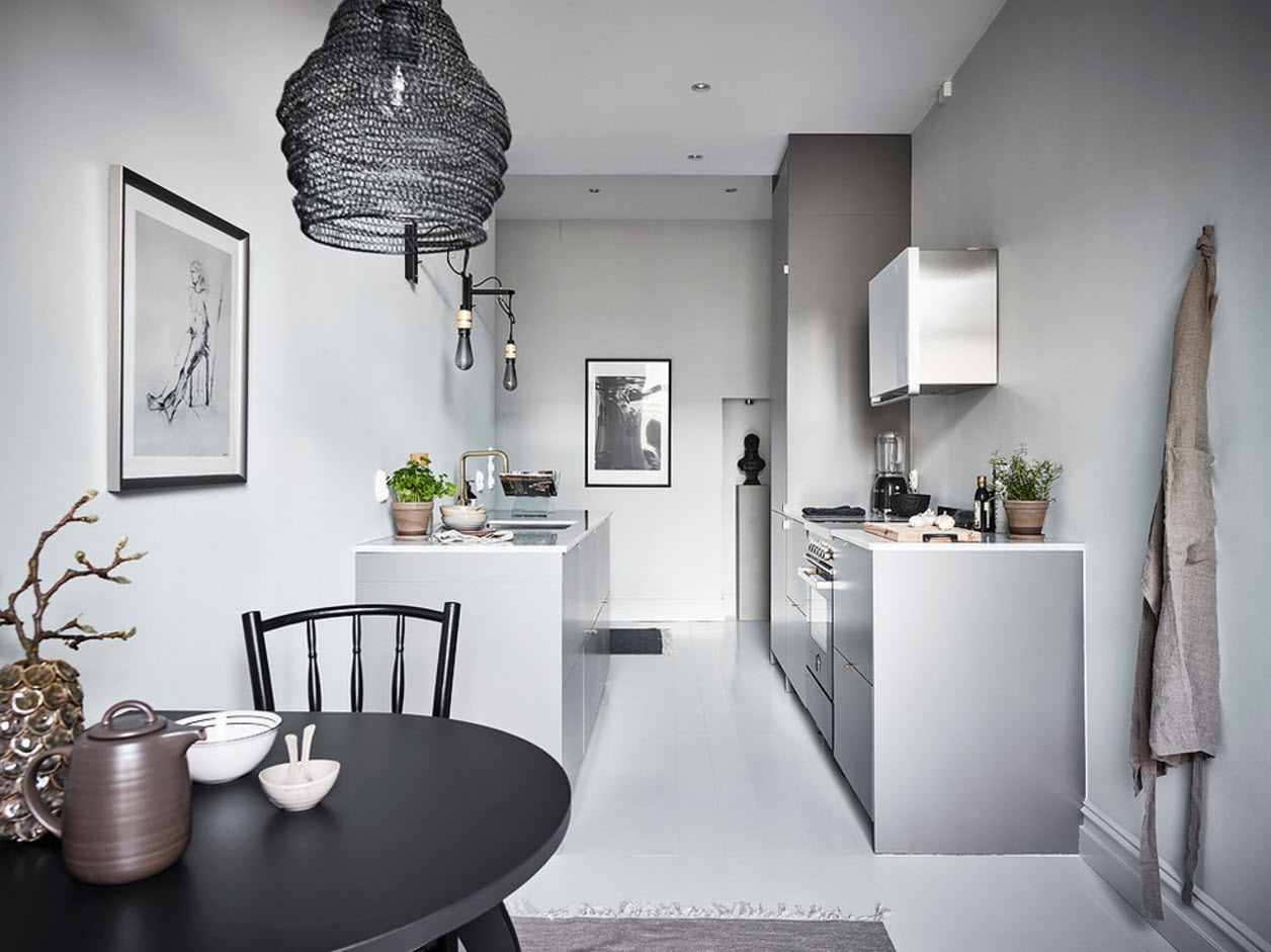 1. Светло-серые тона зрительно расширят границы помещения и не будут скрадывать естественный свет, а потому хорошо подойдут для ремонта пола и стен небольшой и средней кухни.
